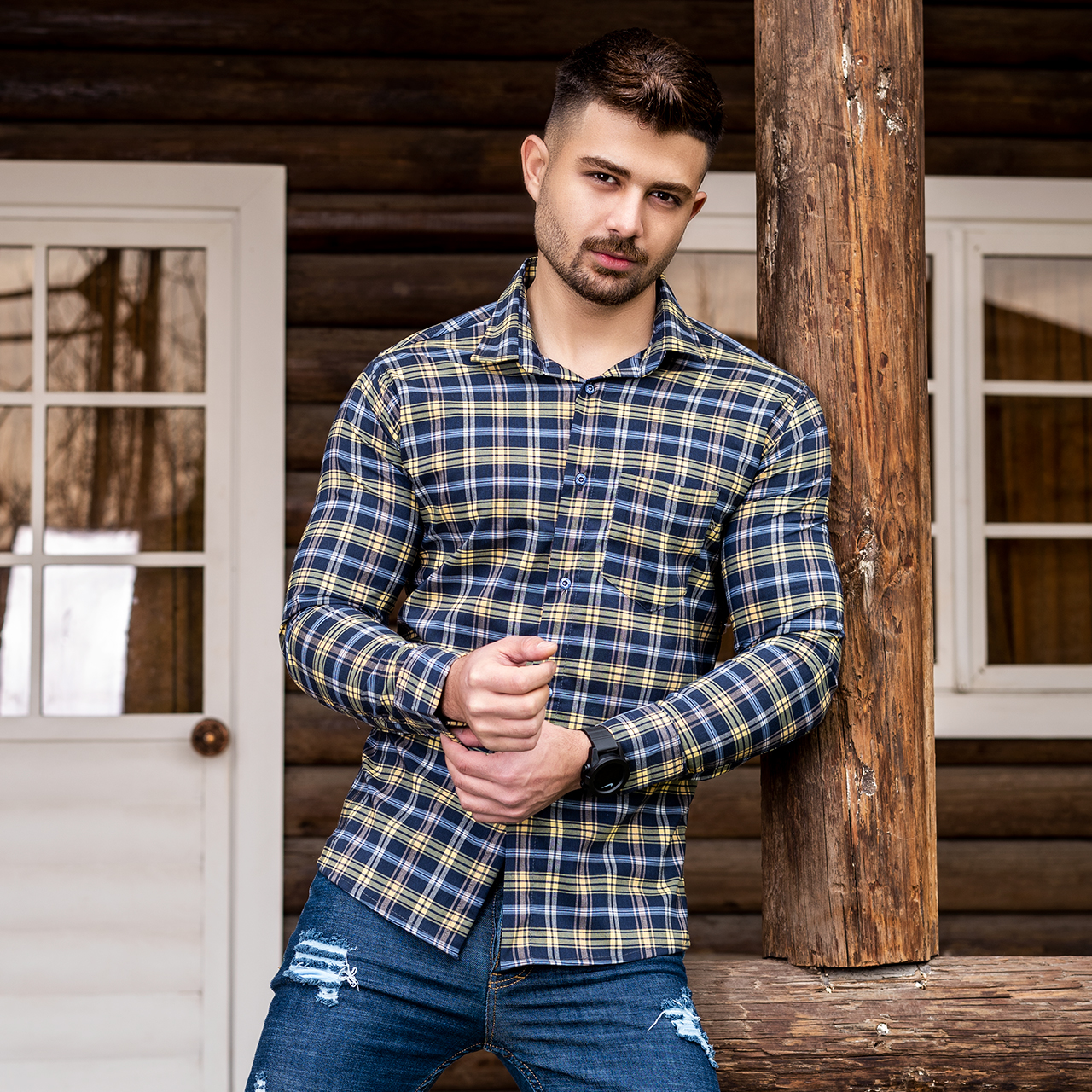 دوتا پیراهن چهارخانه زرد سرمه ای مردانه مدلDivan